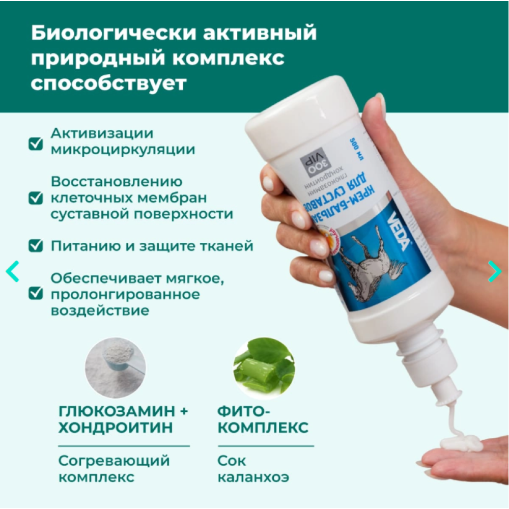 Действие и эффективность крема-бальзама обусловлены композицией природных компонентов, усиленной сочетанием глюкозамина и хондроитина.